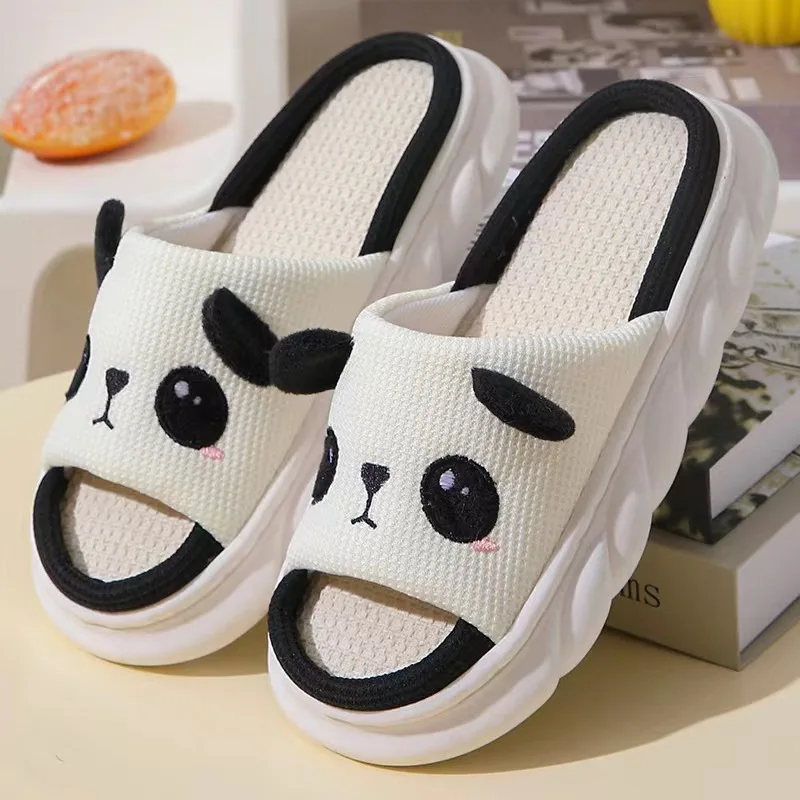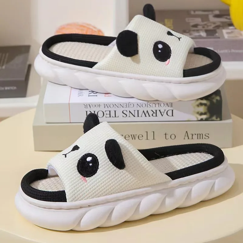 Cute Cartoon Panda Unisex Linen Slippers Spring Summer Slides Mule Men And Women Home Shoes Non-slip Flip Flops For Four Seasons